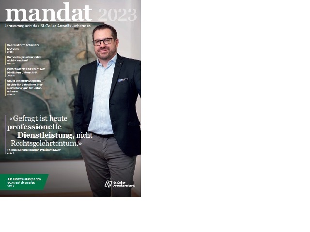 Im Zuge seines Neuauftritts hat der St. Galler Anwaltsverband die Klientenzeitschrift mandat vollständig überarbeitet. Das neu gestaltete Magazin erscheint einmal jährlich und enthält jeweils drei Rubriken: Erstens einen “Aufhänger-Artikel“, wie beispielsweise ein Interview, zweitens rechtliche Beiträge für die interessierte Öffentlichkeit (Rubrik „Wissenswert“) sowie drittens einen Serviceteil, worin Informationen über den SGAV enthalten sind.